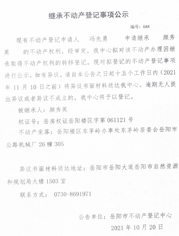 继承不动产登记公示 编号:(2021)继684号(冯先勇)