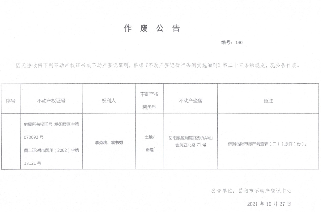 作废公告 编号:140(李焱秋、袁书秀)