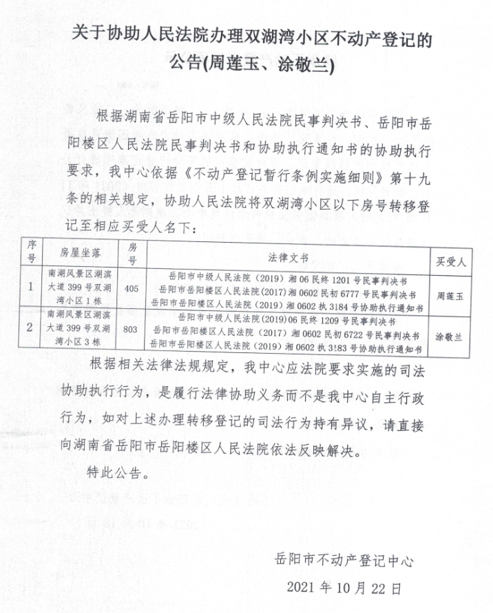 关于协助人民法院办理双湖湾小区不动产登记的公告(周莲玉、涂敬兰)