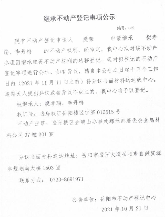 继承不动产登记公示 编号:(2021)继685号(樊荣)