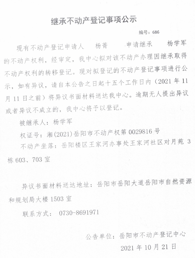 继承不动产登记公示 编号:(2021)继686号(杨菁)