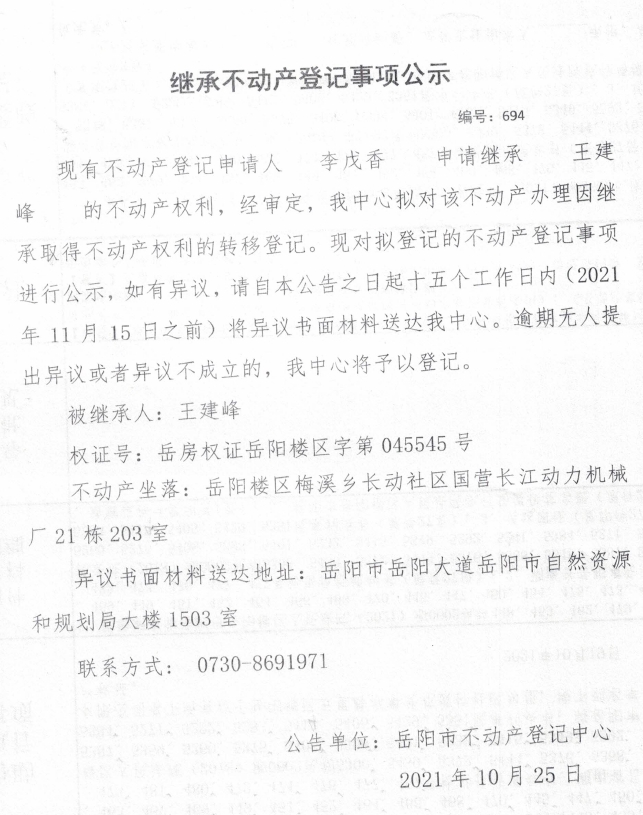 继承不动产登记公示 编号:(2021)继694号(李戊香)