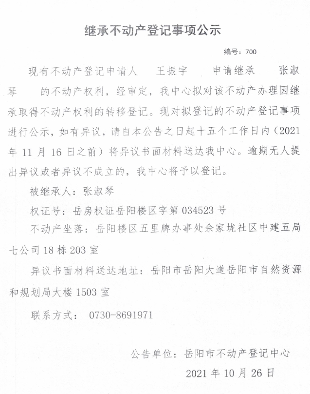 继承不动产登记公示 编号:(2021)继700号(王振宇)