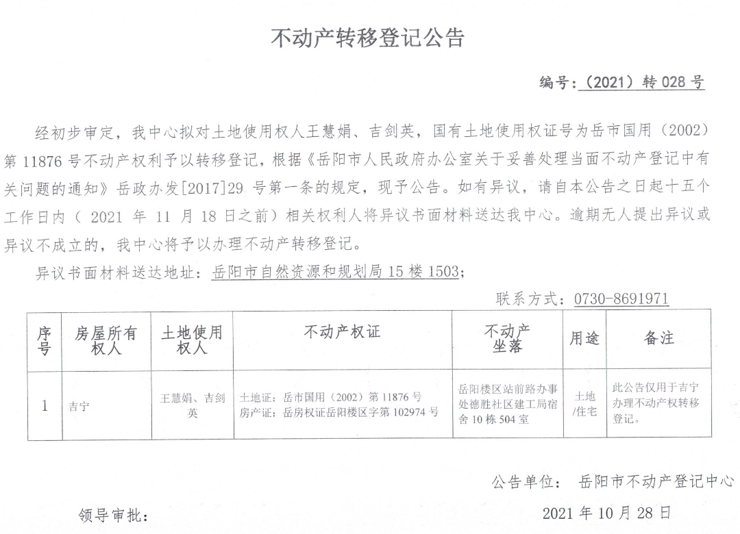 不动产转移登记公告 编号:(2021)转028号(王慧娟、吉剑英)