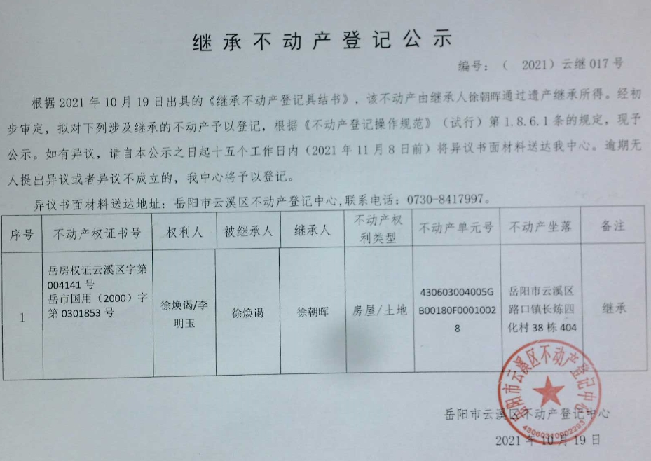 继承不动产登记公示 编号:(2021)云继017号(徐焕谒、李明玉)