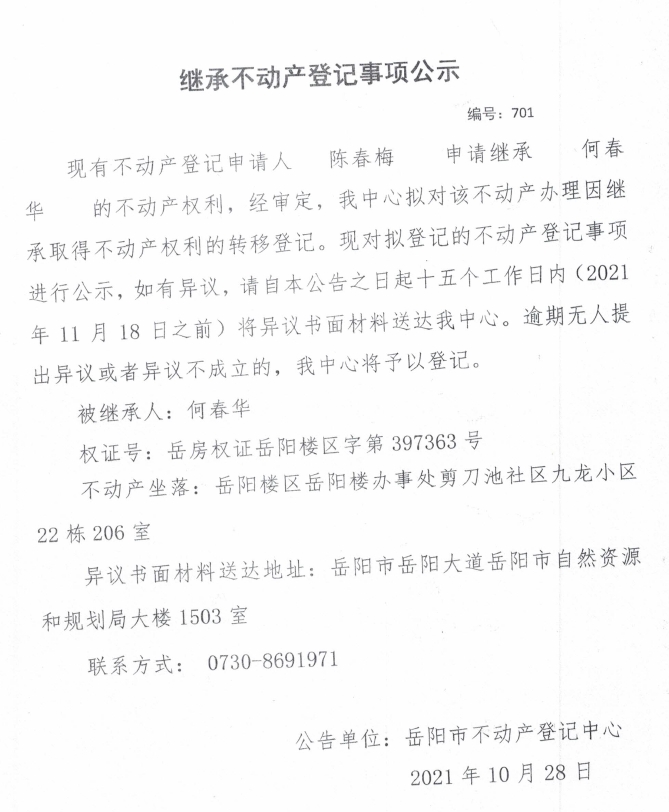 继承不动产登记公示 编号:(2021)继701号(陈春梅)
