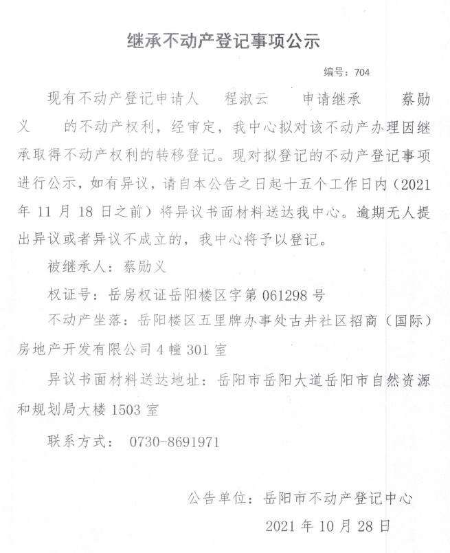 继承不动产登记公示 编号:(2021)继704号(程淑云)