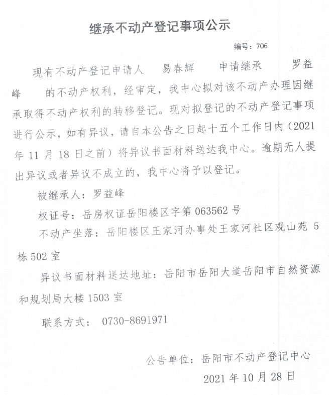 继承不动产登记公示 编号:(2021)继706号(易春辉)