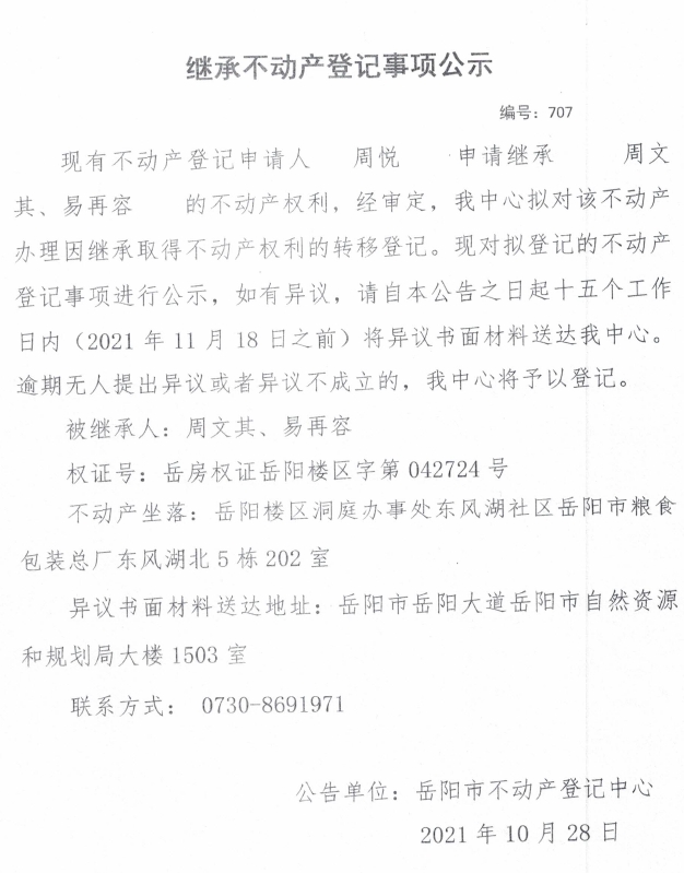 继承不动产登记公示 编号:(2021)继707号(周悦)