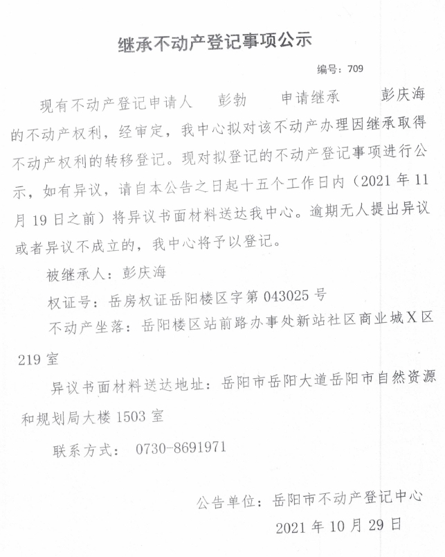 继承不动产登记公示 编号:(2021)继709号(彭勃)
