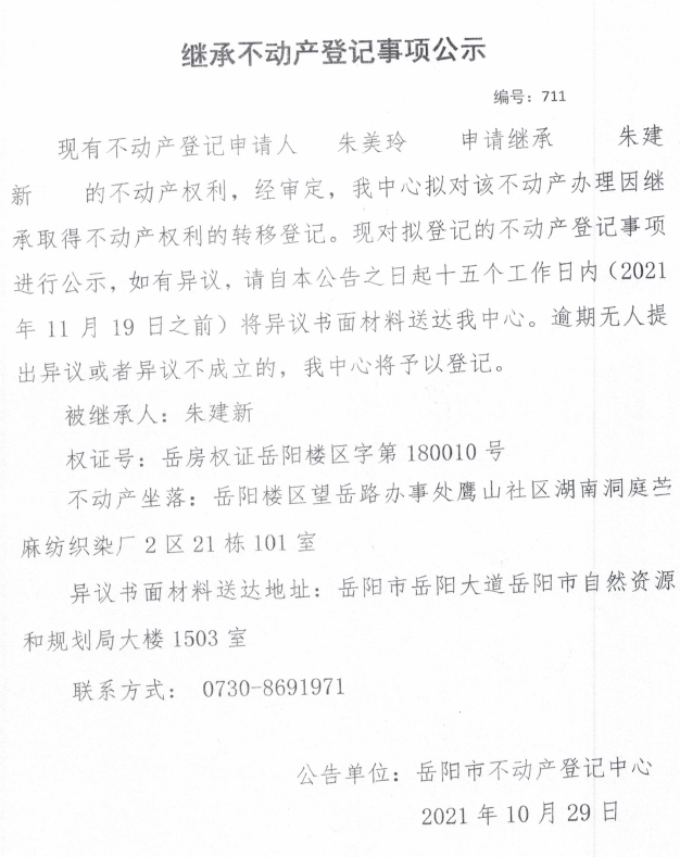 继承不动产登记公示 编号:(2021)继711号(朱美玲)