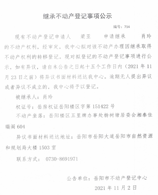 继承不动产登记公示 编号:(2021)继714号(梁亚)