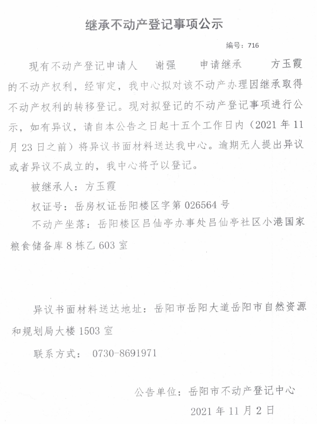 继承不动产登记公示 编号:(2021)继716号(谢强)
