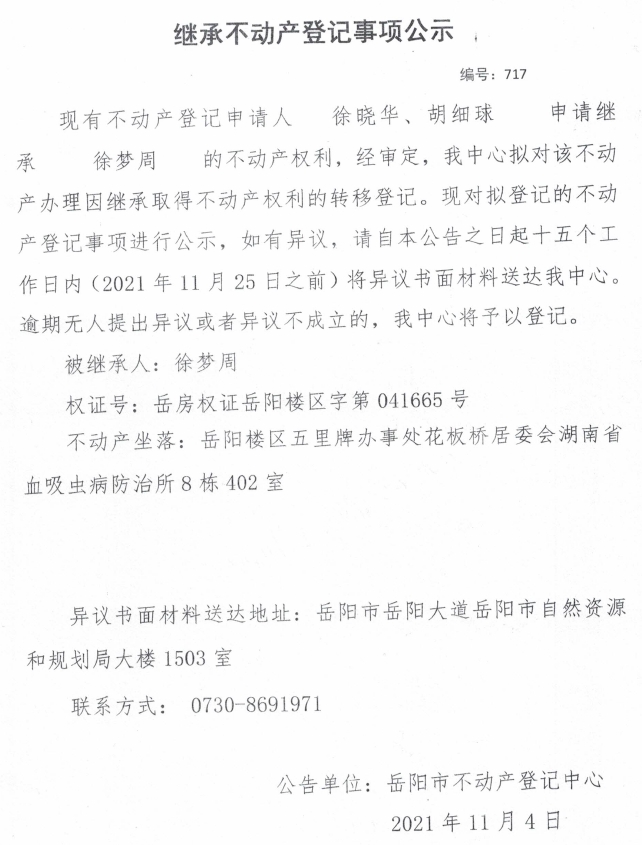 继承不动产登记公示 编号:(2021)继717号(徐晓华)