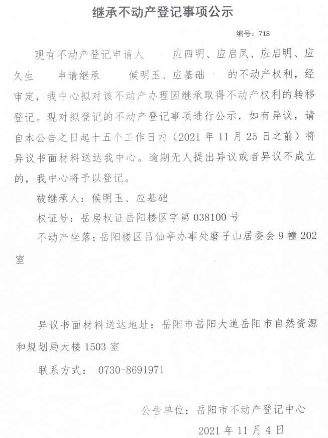 继承不动产登记公示 编号:(2021)继718号(应四明)
