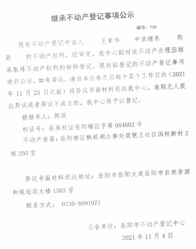 继承不动产登记公示 编号:(2021)继719号(王素华)