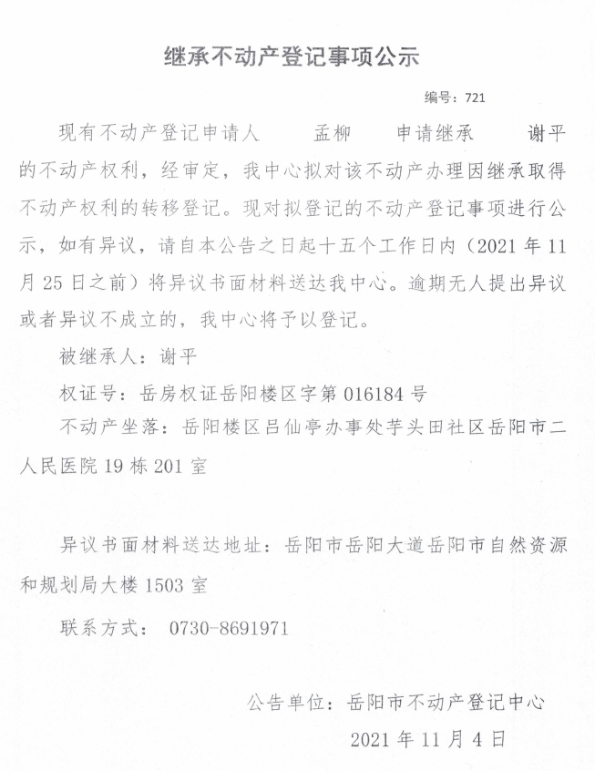 继承不动产登记公示 编号:(2021)继721号(孟柳)