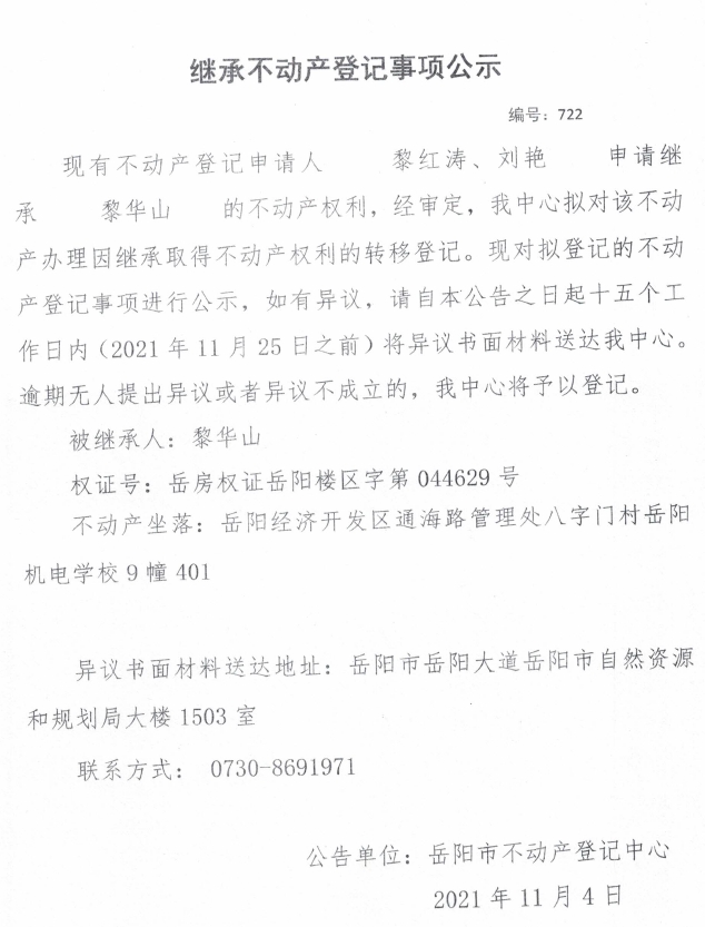 继承不动产登记公示 编号:(2021)继722号(刘艳)