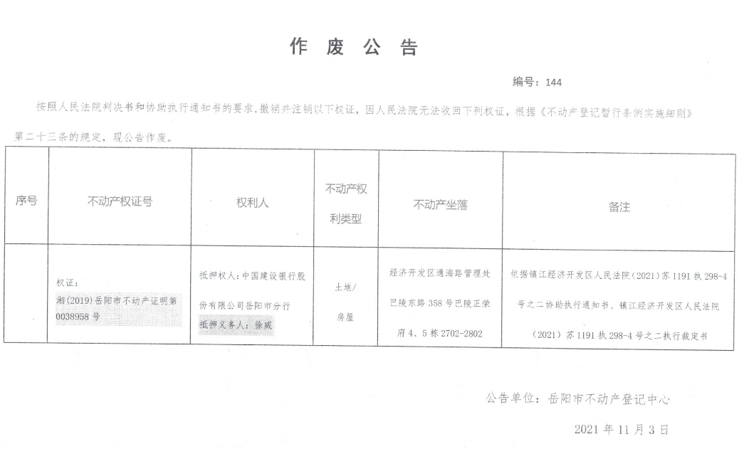 作废公告 编号:144(抵押权人中国建设银行股份有限公司岳阳市分行;抵押义务人徐威)