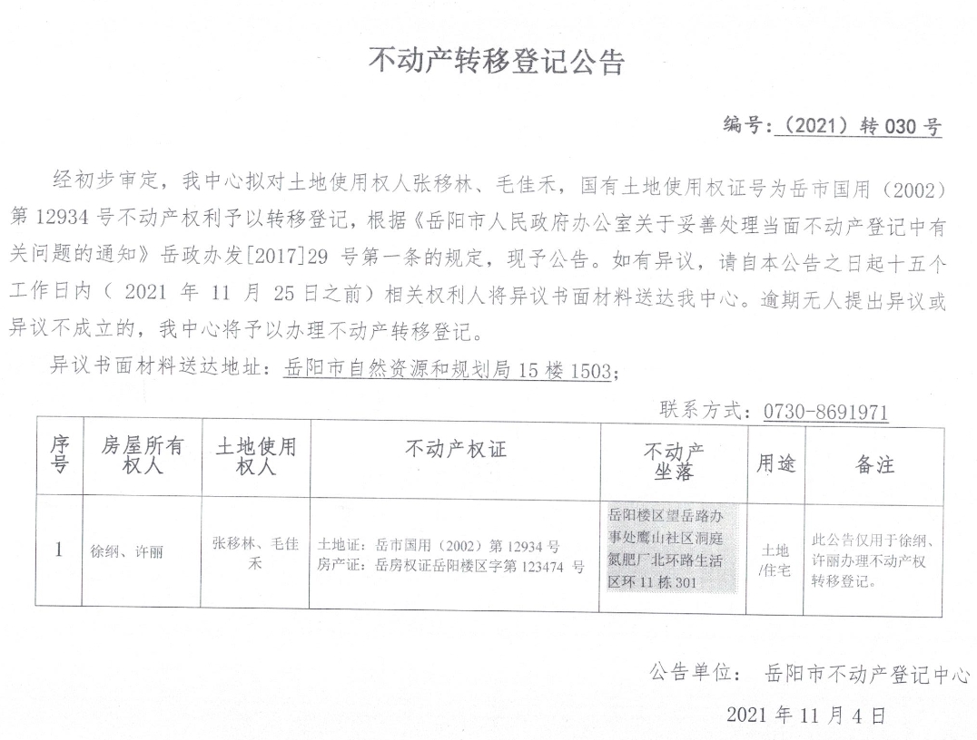 不动产转移登记公告 编号:转030号(张移林、毛佳禾)