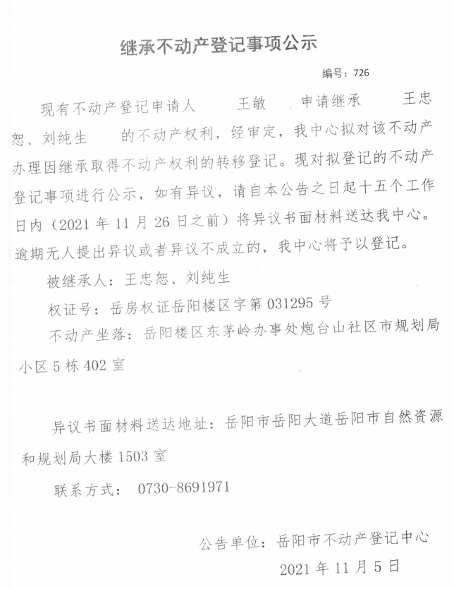 继承不动产登记公示 编号:(2021)继726号(王敏)