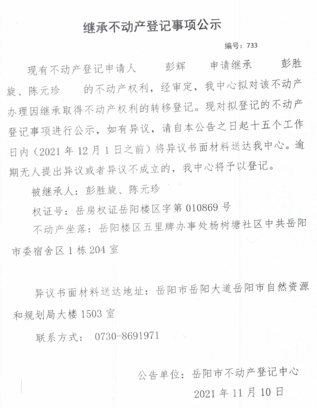 继承不动产登记公示 编号:(2021)继733号(彭辉)