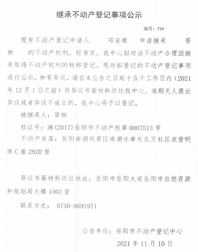 继承不动产登记公示 编号:(2021)继734号(邓安琪)
