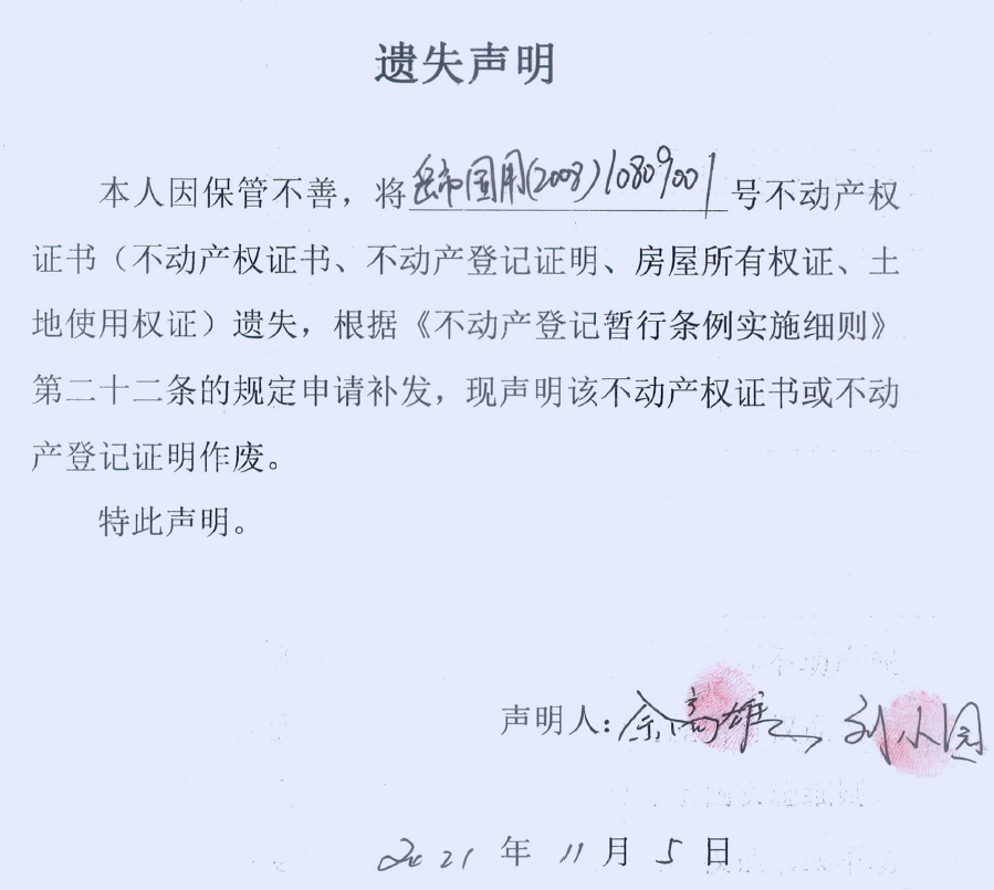 遗失声明(佘高雄、刘小园)