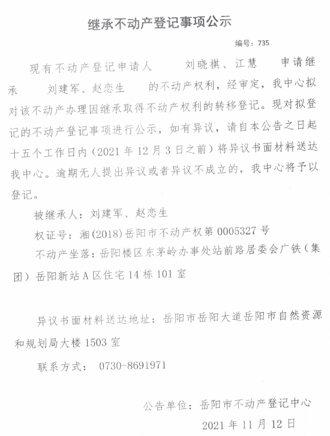 继承不动产登记公示 编号:(2021)继735号(刘晓祺)