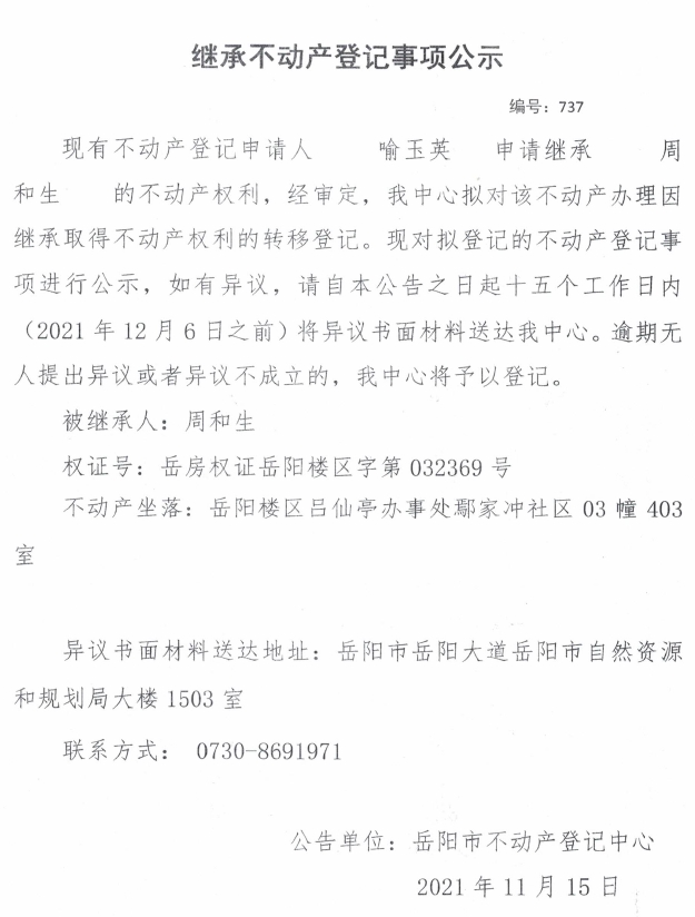 继承不动产登记公示 编号:(2021)继737号(喻玉英)