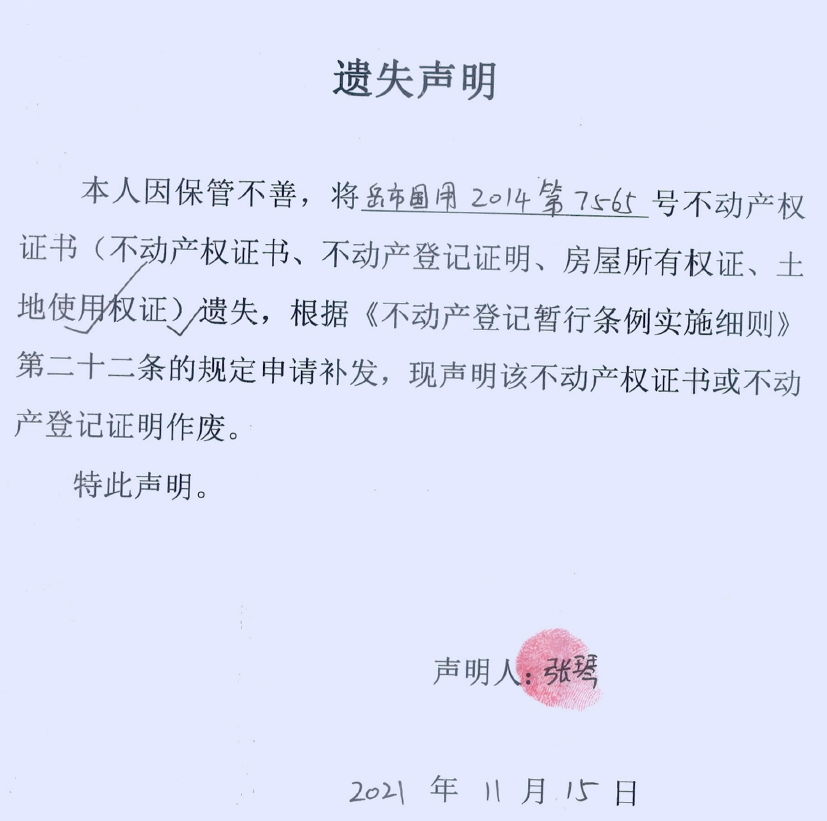 遗失声明(张琴)