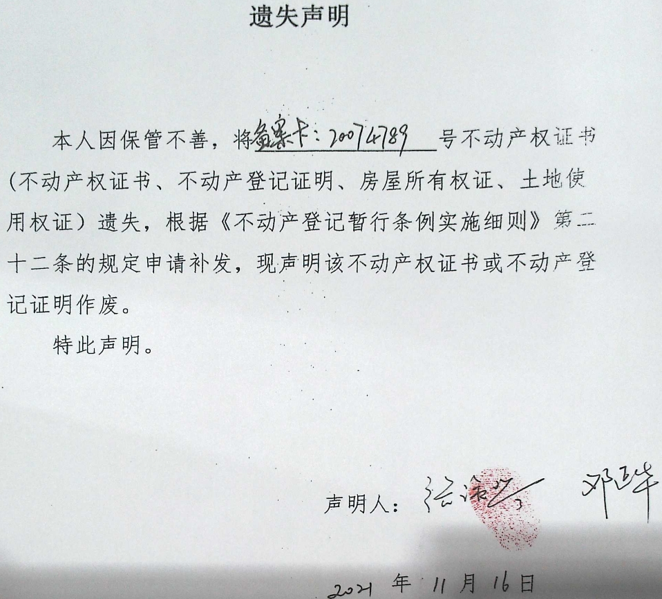 遗失声明(张淑琴、邓正华)