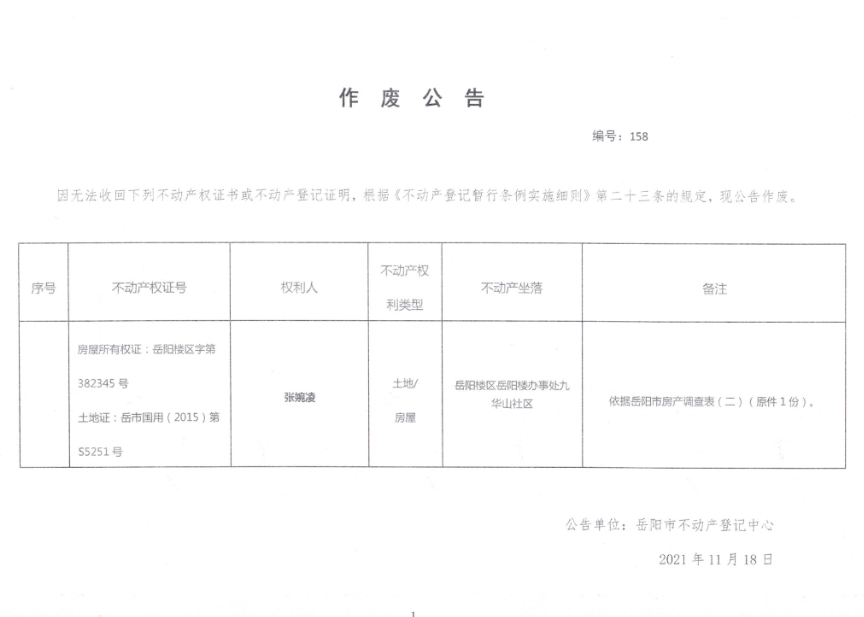 作废公告 编号:158(张婉凌)