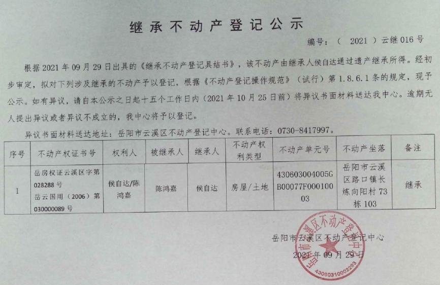 继承不动产登记公示 编号:(2021)云继016号