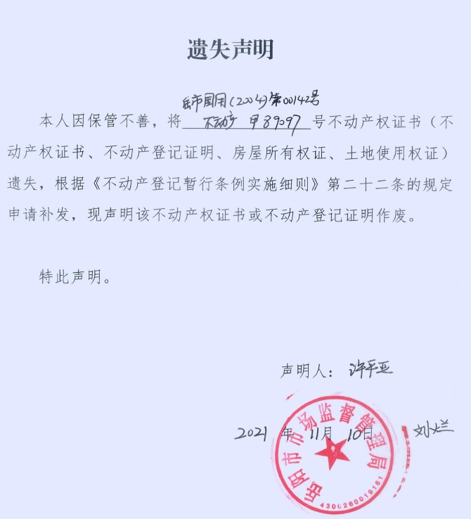 遗失声明(岳阳市技术监督局(岳阳市市场监督管理局))