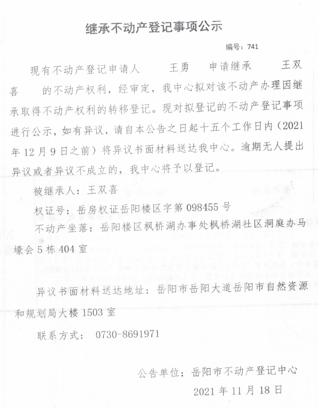 继承不动产登记公示 编号:(2021)继741号(王勇)