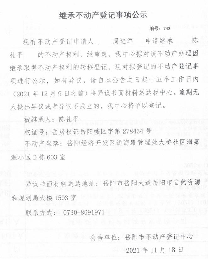 继承不动产登记公示 编号:(2021)继742号(周进军)