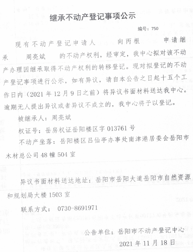 继承不动产登记公示 编号:(2021)继750号(向丙根)