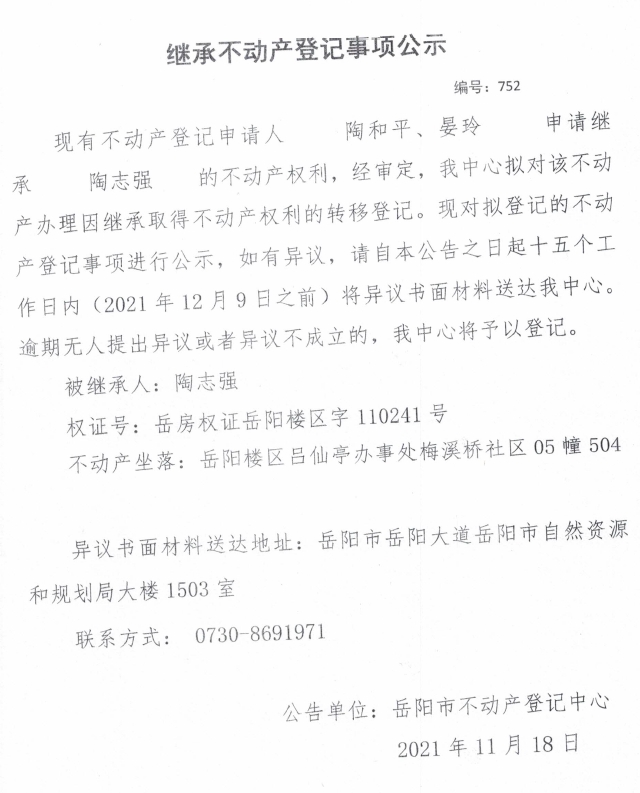 继承不动产登记公示 编号:(2021)继752号(陶和平)