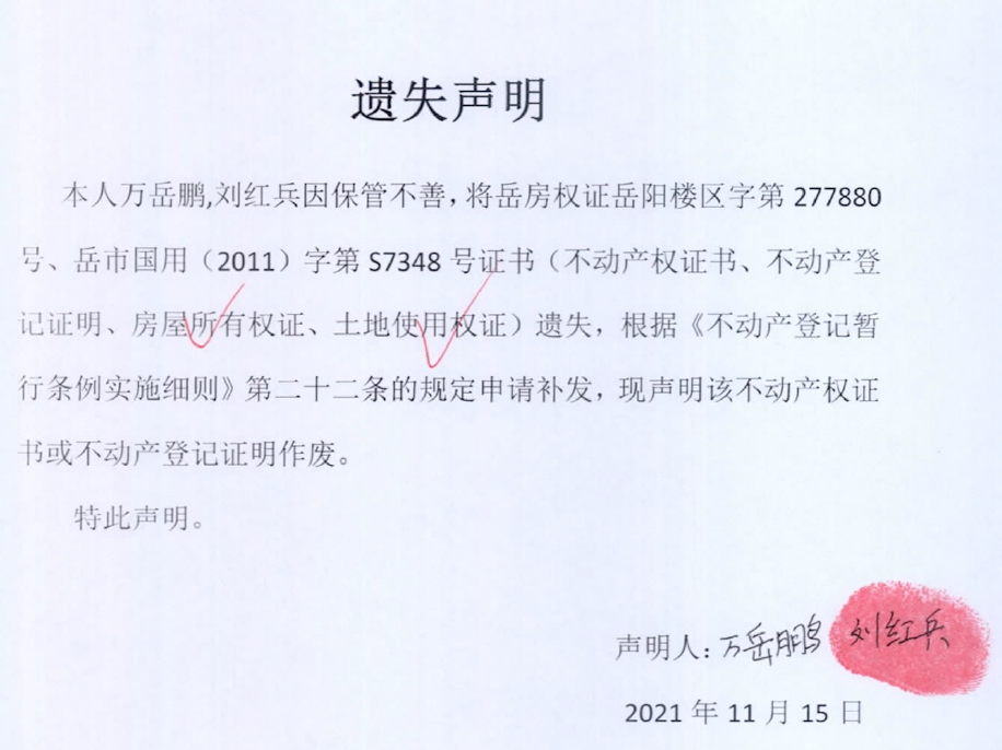 遗失声明(万岳鹏、刘红兵)