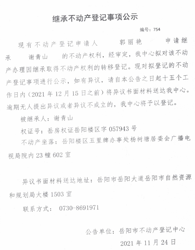 继承不动产登记公示 编号:(2021)继754号(郭丽艳)