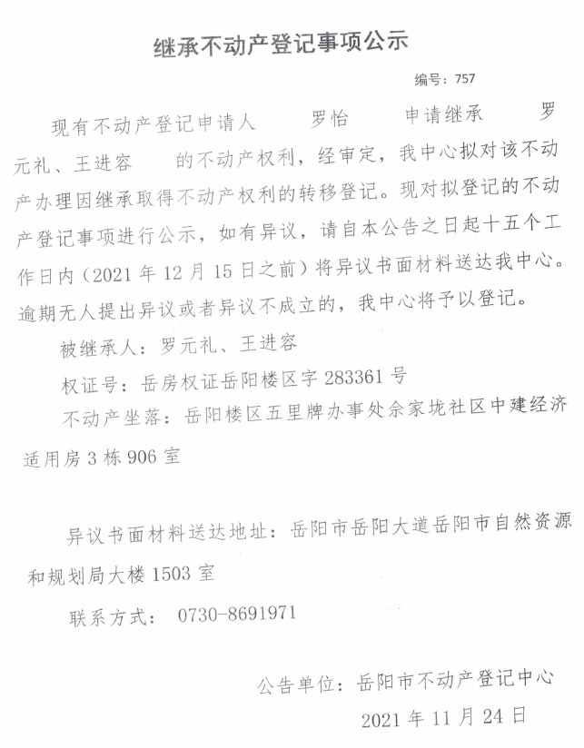 继承不动产登记公示 编号:(2021)继757号(罗怡)