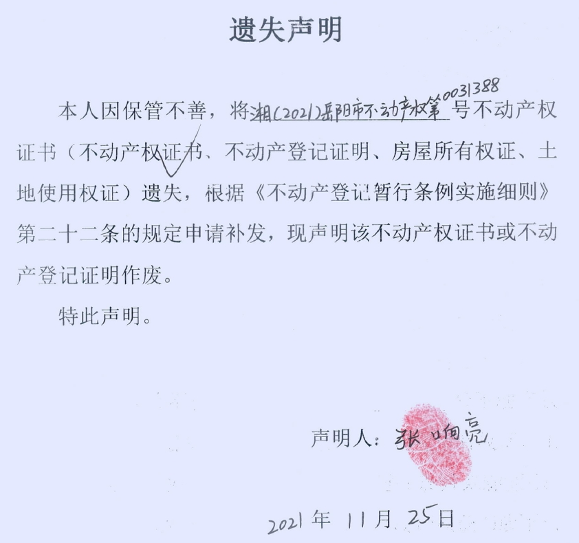 遗失声明(张响亮)