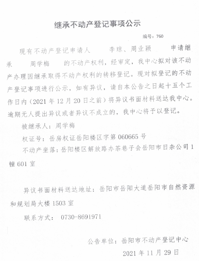 继承不动产登记公示 编号:(2021)继760号(李琼)