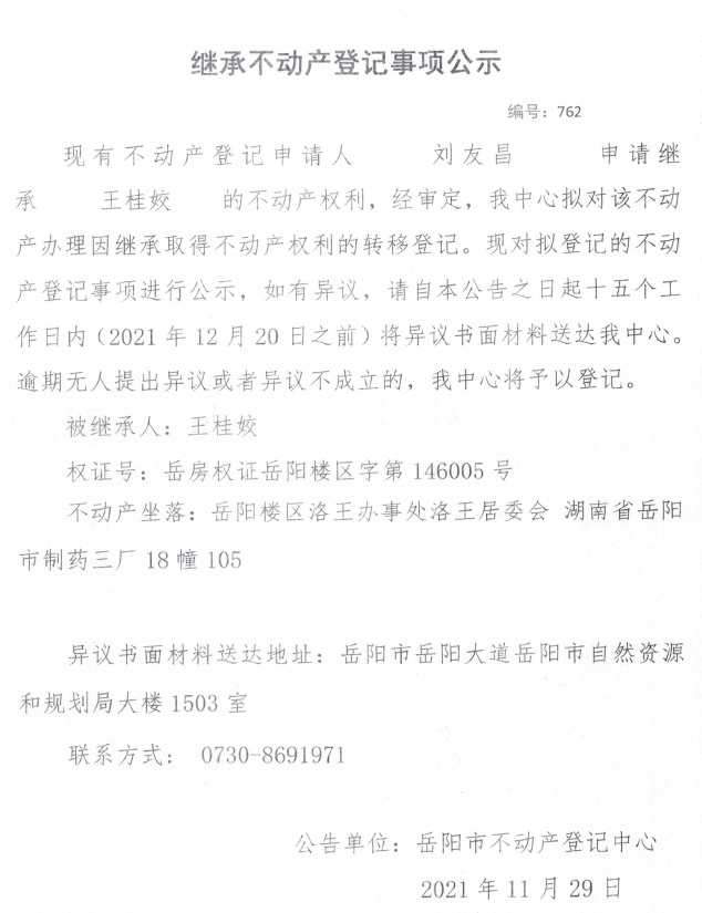 继承不动产登记公示 编号:(2021)继762号(刘友昌)