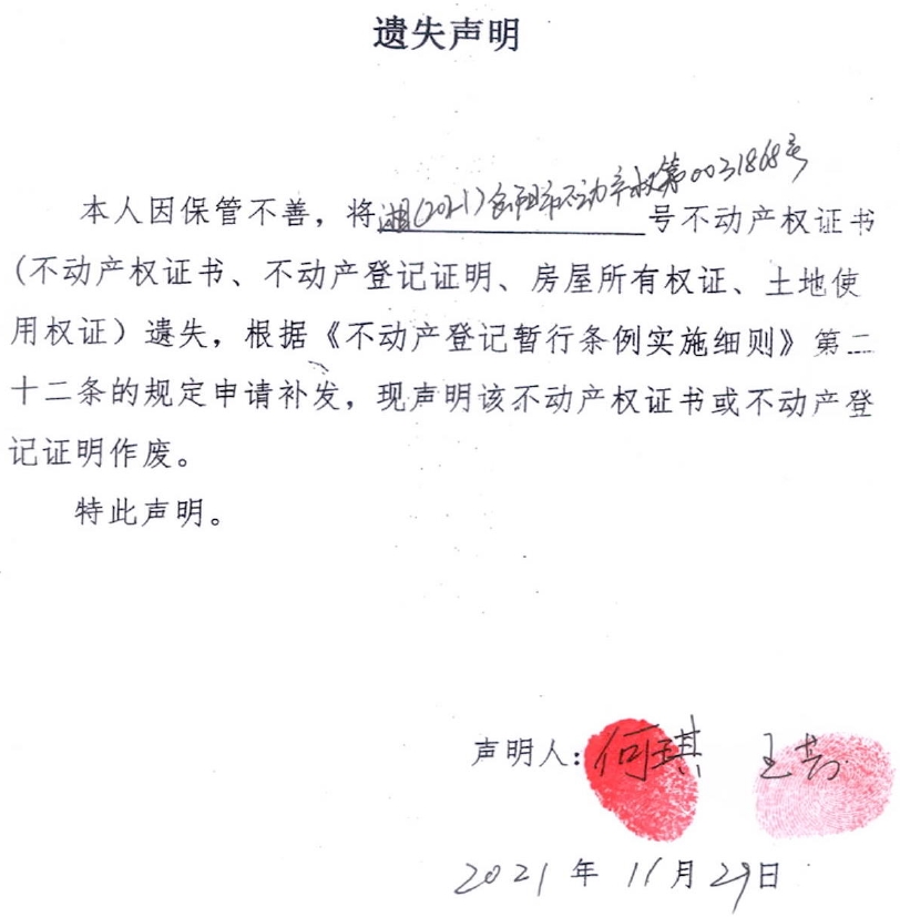 遗失声明(何琪、王芳)