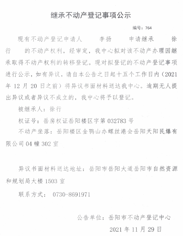 继承不动产登记公示 编号:(2021)继764号(李扬)
