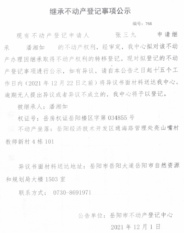 继承不动产登记公示 编号:(2021)继766号(张三九)