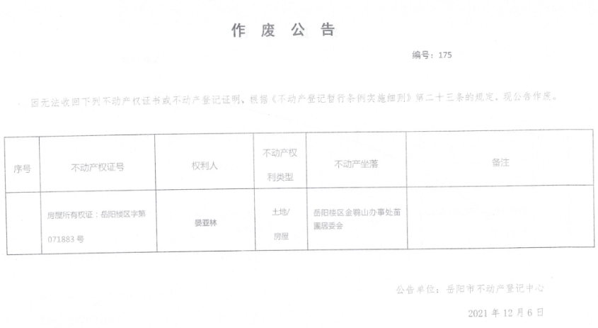 作废公告 编号:175(晏亚林)