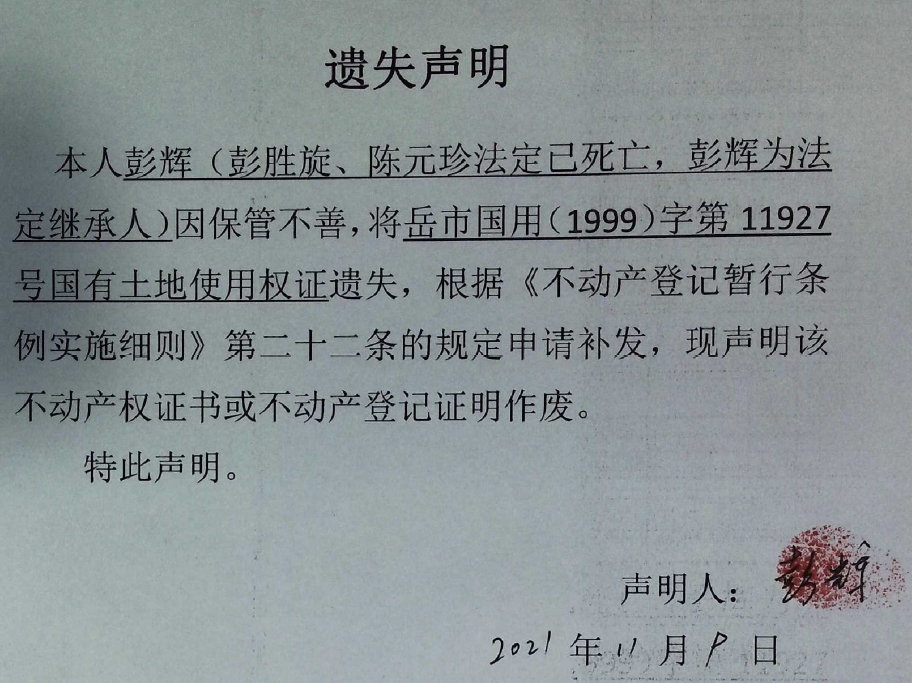 遗失声明(彭胜旋(已故)、陈元珍(已故))-彭辉代